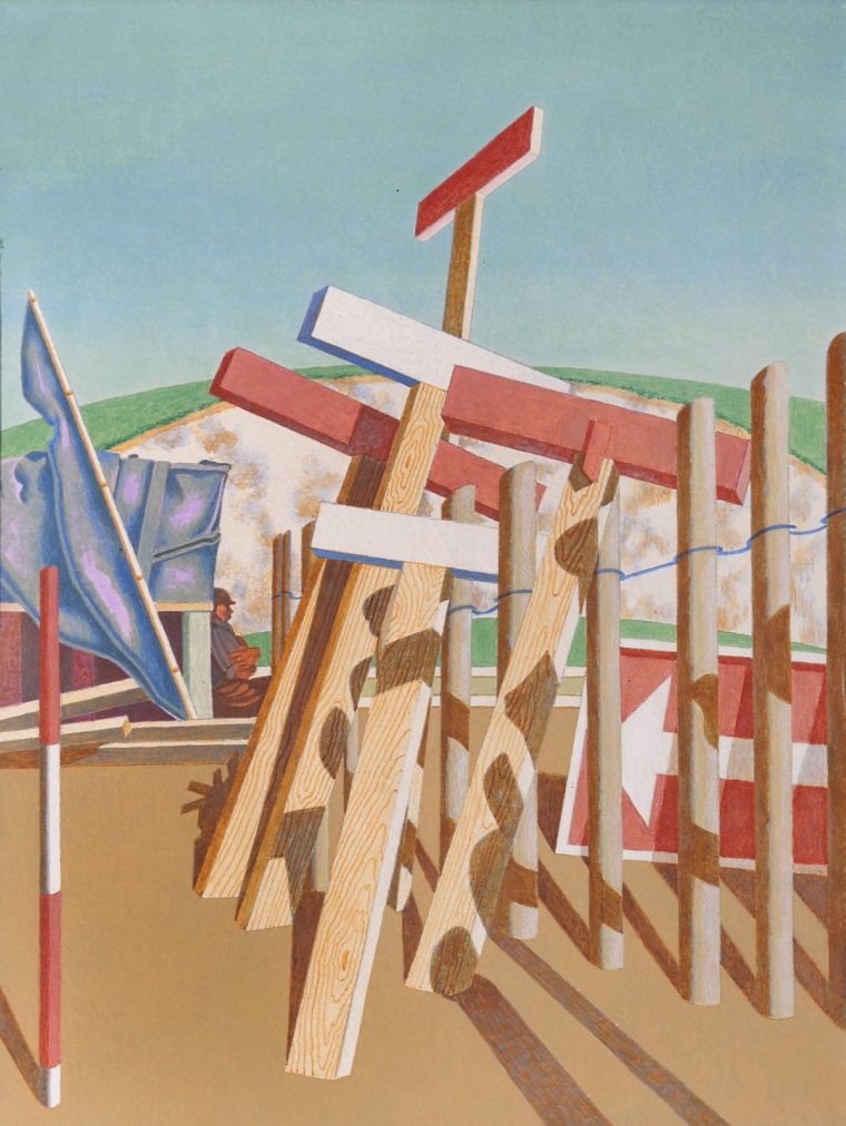 In 1937, Yorkshire-born Edward Wadsworth, who had been part of the Vorticist movement prior to its brief existence being cut short by the onset of World War I, created a work reminiscent of this approach. Sussex Bypass .