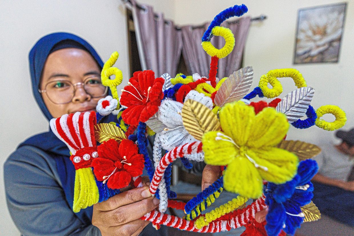 Housewife Aziefitri Morni is making headbands in the Jalur Gemilang’s colours for kindergarten pupils in Kampung Lintang Baru, Serian, near here.
