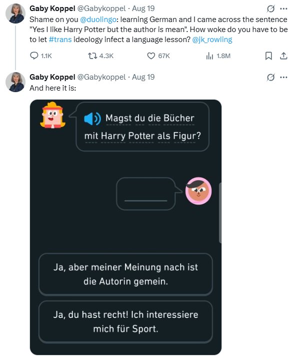 Posting a screenshot on X, she wrote: ‘Shame on you @duolingo: learning German and I came across the sentence “Yes I like Harry Potter, but the author is mean. How woke do you have to be to let #trans ideology infect a language lesson?’
