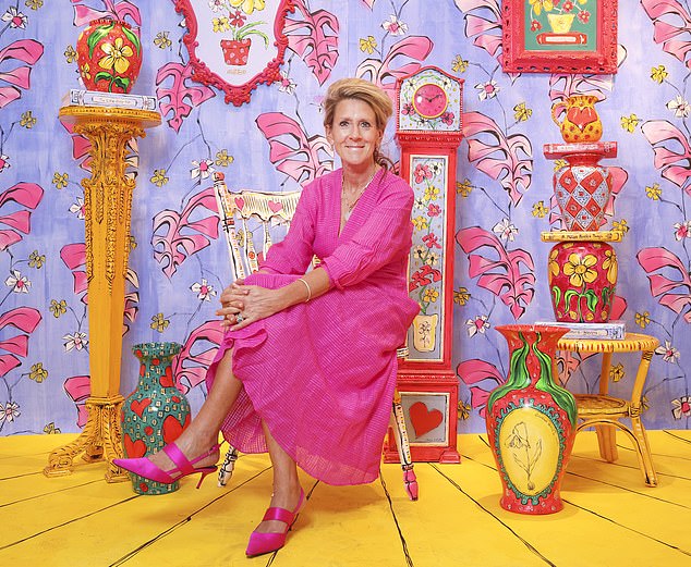 The former womenswear boss, 59, is herself awash with colour, in a bright pink dress and matching heels that almost allow her to blend in with the paintings on the walls.