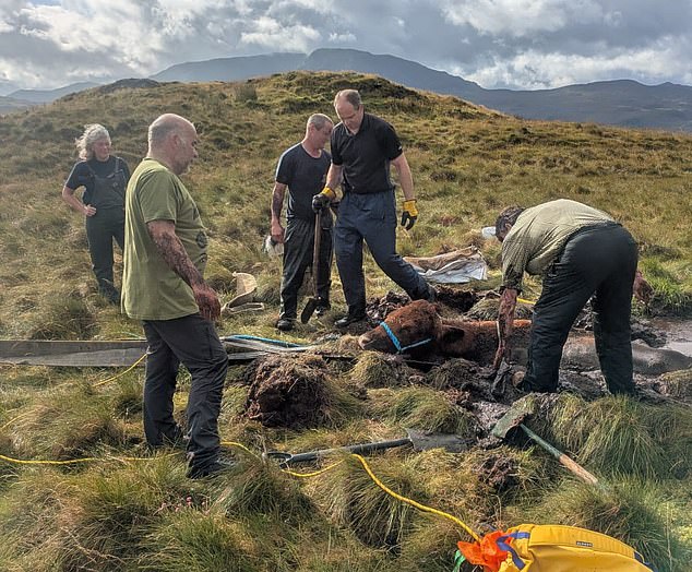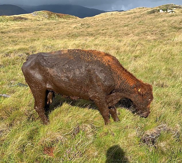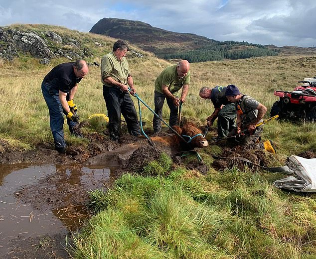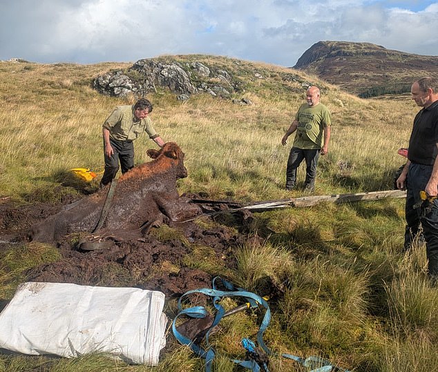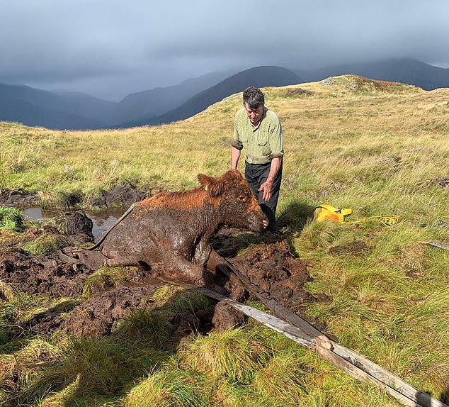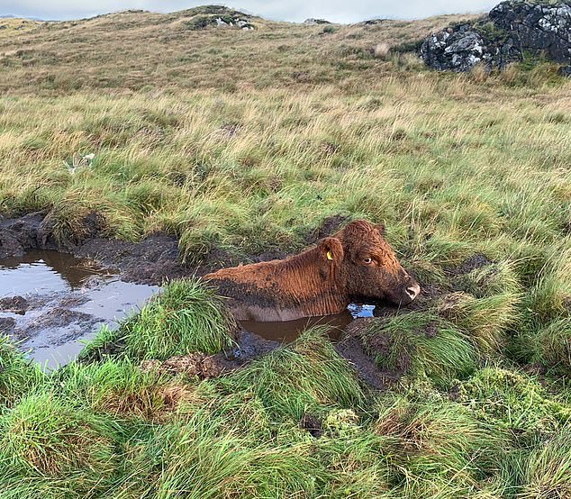 A spokesman from the Inverness-shire based mountain rescue team said: ‘The team went to the rescue of a cow that had become trapped in mud on the hill.